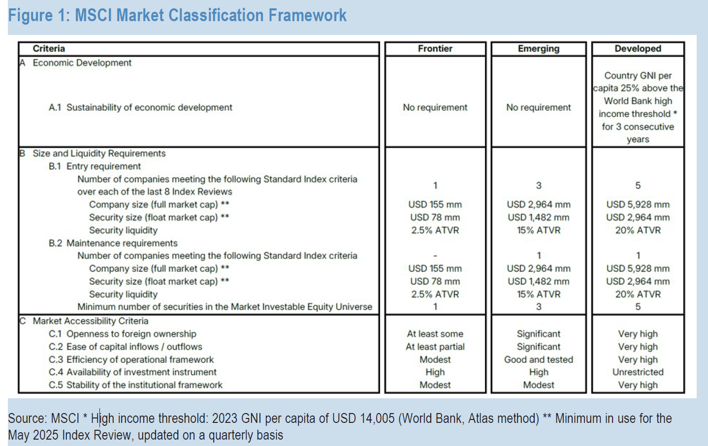 Η Ελλάδα, ως μέλος του δείκτη MSCI Emerging Markets, έχει σήμερα σχετικό βάρος περίπου 4% στον MSCI EMEA EM και 0,60% στον συνολικό MSCI EM. Αν προχωρήσει η αναβάθμιση, τότε θα μεταπηδήσει στον MSCI Europe, αποκτώντας εκεί μερίδιο μόλις 0,40% και θα αντιστοιχεί σε μόλις 0,07% του MSCI World.