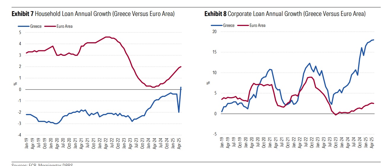Η μείωση των επιτοκίων και η ανθεκτικότητα της ελληνικής οικονομίας συνέχισαν να στηρίζουν τη νέα δανειοδότηση. Η χρηματοδότηση στα νοικοκυριά κατέγραψε θετική μεταβολή τον Μάιο 2025 (αν και υπολείπεται του μέσου όρου της Ευρωζώνης), ενώ οι χορηγήσεις προς επιχειρήσεις αυξήθηκαν κατά περίπου 18% YOY, ξεπερνώντας σημαντικά τον ευρωπαϊκό μέσο όρο.