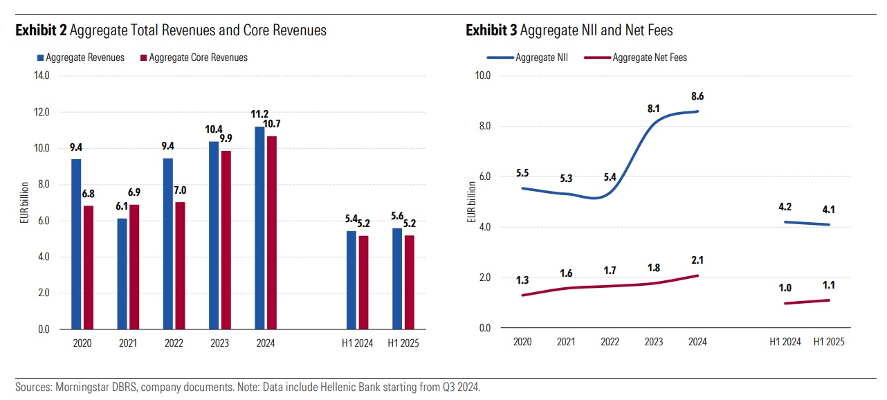 Τα ισχυρά έσοδα από προμήθειες και τα έσοδα από το trading, σε συνδυασμό με τον έλεγχο του κόστους και τις σταθερές πιστωτικές ζημιές, αντιστάθμισαν τη μείωση των καθαρών εσόδων από τόκους (NII). Ωστόσο, η μέση απόδοση ιδίων κεφαλαίων (ROE) μειώθηκε σε (ακόμη επαρκές επίπεδο) 13% το Α’ εξάμηνο του 2025 από 14% το αντίστοιχο διάστημα του 2024, κυρίως λόγω της συσσώρευσης κεφαλαίων.