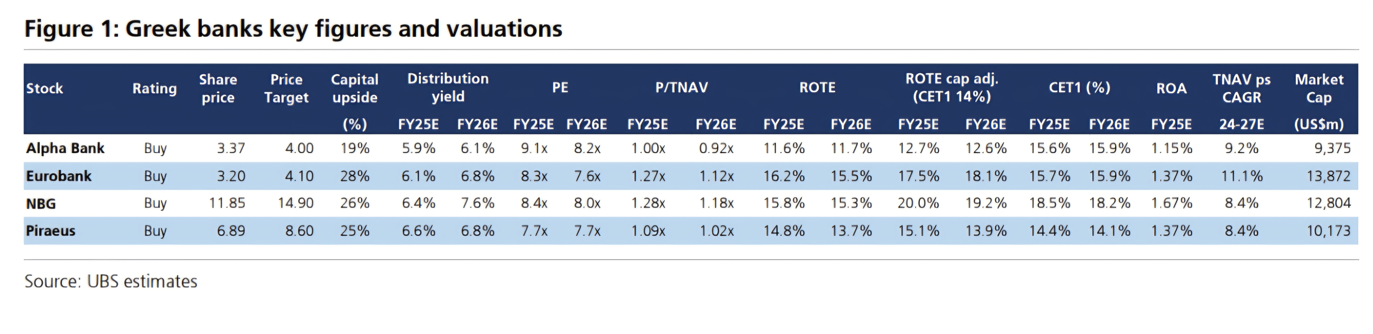 Η UBS επισημαίνει τη Eurobank ως κορυφαία επιλογή, χάρη στην ισχυρή περιφερειακή της θέση και τις υψηλές διανομές, ενώ αναδεικνύει και την Τράπεζα Πειραιώς για τη δυνατότητα περαιτέρω ανατίμησης. Η Εθνική Τράπεζα ξεχωρίζει για τον σημαντικό «χώρο» επιστροφής κεφαλαίου, ενώ η Alpha Bank παραμένει σταθερή επιλογή λόγω των συνεργειών με UniCredit και της αναμενόμενης βελτίωσης της κερδοφορίας.