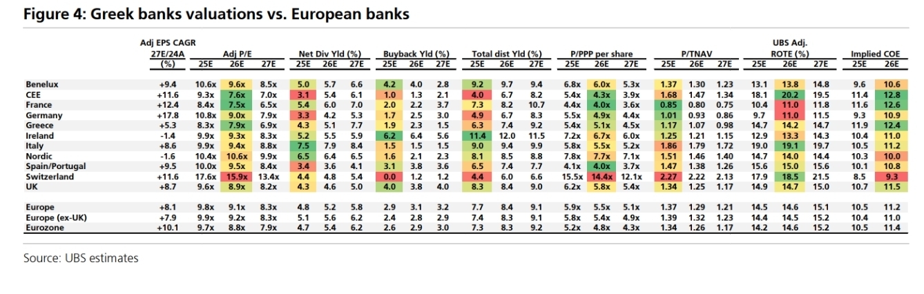 Η σημερινή έκθεση υπογραμμίζει πως παρότι οι τραπεζικές μετοχές έχουν ήδη κερδίσει περίπου 70% από την αρχή του έτους, οι αποτιμήσεις παραμένουν ελκυστικές. Ο κλάδος διαπραγματεύεται σε δείκτη τιμής προς κέρδη (P/E) 7,9 φορές για το 2026 και 6,9 φορές για το 2027, σε σύγκριση με τον μέσο όρο των ευρωπαϊκών τραπεζών, που βρίσκεται στις 9,1 φορές και 8,3 φορές, αντίστοιχα.