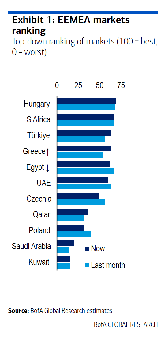 Σύμφωνα με την ανάλυση της BofA, η Ελλάδα καταλαμβάνει την τέταρτη θέση στο συνολικό country ranking της EEMEA, βελτιώνοντας τη θέση της σε σχέση με τον προηγούμενο μήνα.