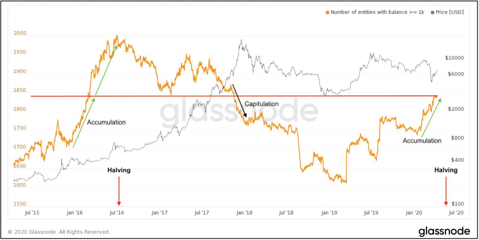 Όσο πλησιάζουμε προς το φαινόμενο του halving -μόλις 25 ημέρες έμειναν- τόσο η τωρινή συγκυρία μοιάζει με τις προηγούμενες περιπτώσεις. Το παρακάτω διάγραμμα μας δείχνει την πορεία του αριθμού των οικονομικών οντοτήτων που κατέχουν τουλάχιστον 1.000 bitcoin. Όπως και το 2016, προηγήθηκε μια περίοδος όπου αυξάνονταν συνεχώς. Άραγε αυτό σημαίνει πως θα ακολουθήσει σε λίγο καιρό μια νέα έντονη ανοδική αγορά; Σύντομα θα έχουμε την απάντηση.