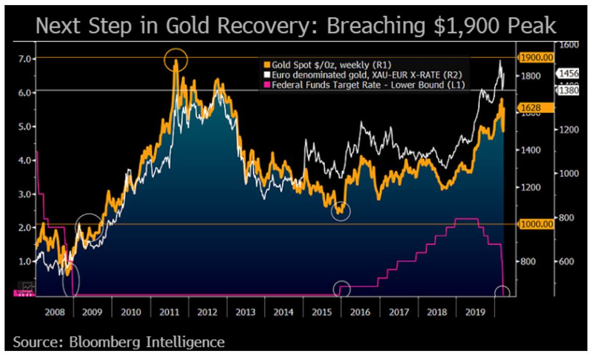 Κατά την άποψή των αναλυτών Mike McGlone, Gina Martin Adams, Michael Casper, Ben Elliott και Nathan Dean (https://data.bloomberglp.com/professional/sites/10/Bloomberg-Crypto-Outlook-April-2020.pdf), η αναταραχή στα χρηματιστήρια θα προκαλέσει την προσωρινή υποχώρηση το bitcoin, αλλά η συνέχεια θα θυμίζει την ανοδική πορεία του χρυσού μετά την οικονομική κρίση του 2008 (σ.σ. τριπλασιάστηκε η αξία του). Εάν η ιστορία είναι οδηγός, αναφέρουν, η υποχώρηση σε χρυσό και bitcoin είναι προσωρινή. Έχουν δει τα χαμηλά τους.
