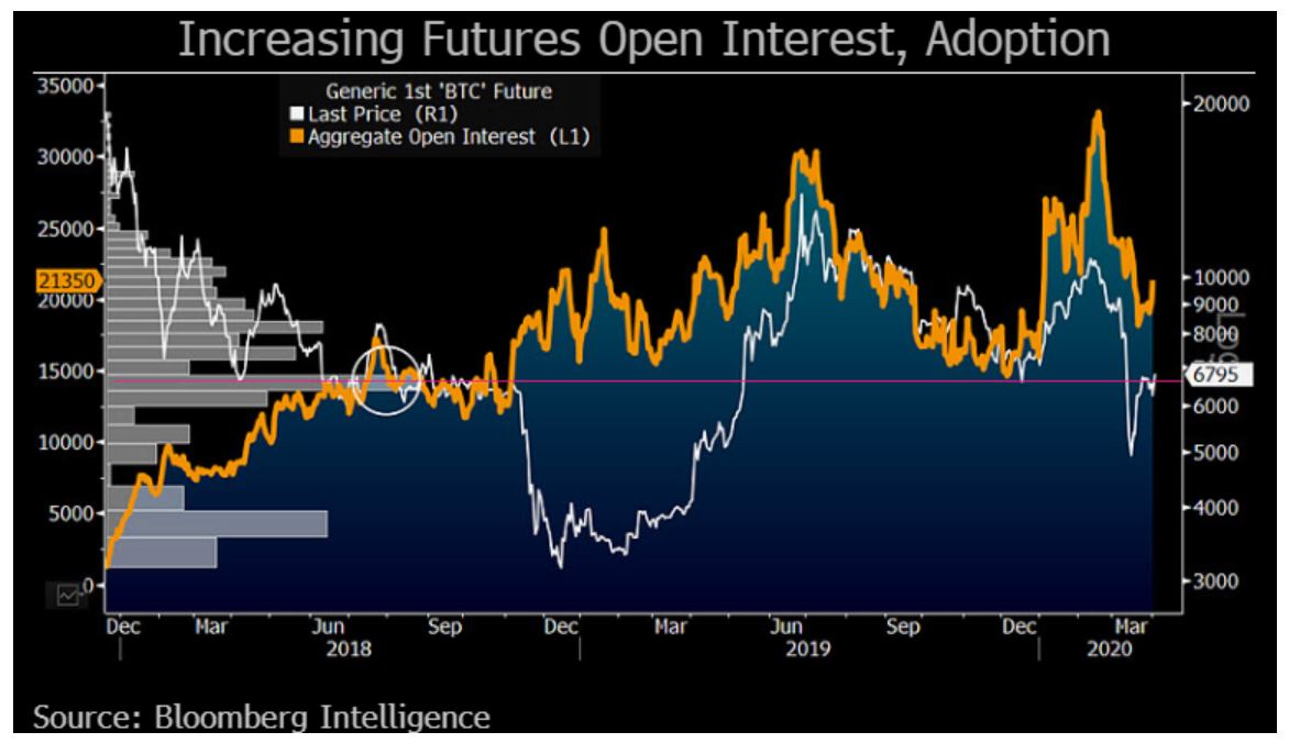 Με τις Κεντρικές Τράπεζες σε όλο τον κόσμο να ρίχνουν τρισεκατομμύρια δολάρια στην οικονομία, το 2020 μπορεί να είναι η χρονιά που το bitcoin θα μετατραπεί σε νέο χρυσό για την ψηφιακή οικονομία. Η συσχέτιση της πορείας της τιμής του bitcoin με τον χρυσό είναι διπλάσια, αν τη συγκρίνουμε με τις μετοχές. Κι όσο πιο πολύ θα ωριμάζει, τόσο θα εντείνεται. Τα συμβόλαια μελλοντικής εκπλήρωσης (futures) βοήθησαν να τιθασευτεί η έντονη ανοδική κίνηση του bitcoin. Οι αναλυτές ισχυρίζονται ότι είναι μέρος της διαδικασίας μετάβασης προς μια συμπεριφορά που μοιάζει με το χρυσό. Η αύξηση του όγκου στα futures αντανακλά μια αγορά που ωριμάζει.