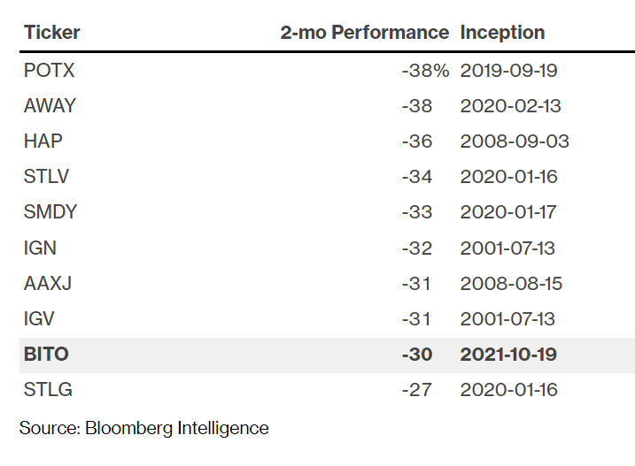 Με πτώση 30%, το διαπραγματεύσιμο αμοιβαίο κεφάλαιο ProShares Bitcoin Strategy, το BITO, καταγράφει μια από τις 10 χειρότερες επιδόσεις, όταν εξετάζουμε τις αποδόσεις δύο μήνες μετά από μια δημόσια εγγραφή, σύμφωνα με τα στοιχεία που αναλύει ο κ. Αθανάσιος Ψαροφάγης του Bloomberg Intelligence.