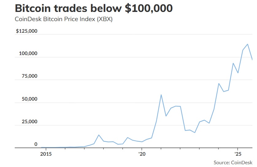 Καθώς το bitcoin διαπραγματευόταν κάτω από το κρίσιμο ορόσημο των 100.000 δολαρίων αυτή την εβδομάδα, οι πρόσφατες ρευστοποιήσεις από «φάλαινες» — δηλαδή κατόχους μεγάλων ποσοτήτων του κρυπτονομίσματος — καθώς και άλλους μακροπρόθεσμους επενδυτές αναδείχθηκαν σε σημαντικό παράγοντα της πρόσφατης αδυναμίας.