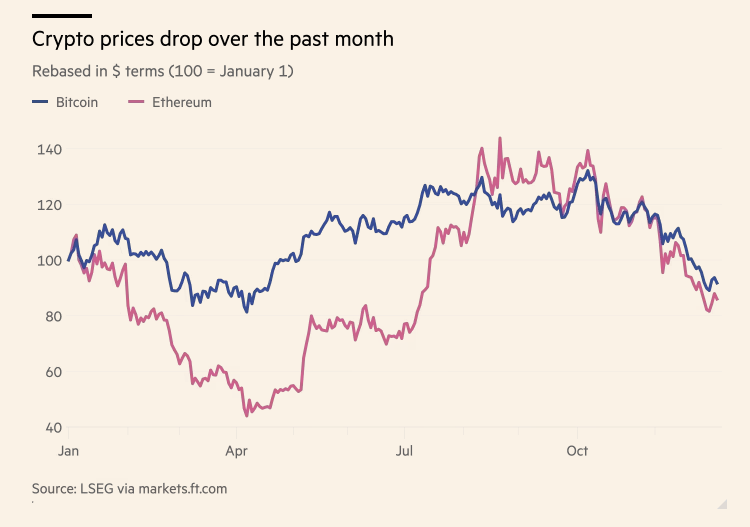 Ωστόσο, η τρέλα έχει ξεθυμάνει, καθώς τα κρυπτονομίσματα υπέστησαν το μεγαλύτερο πλήγμα από την πώληση κερδοσκοπικών περιουσιακών στοιχείων αυτό το φθινόπωρο, σε μια απότομη ανατροπή για έναν τομέα που είχε ενισχυθεί από την υπόσχεση του Προέδρου Ντόναλντ Τραμπ πέρυσι να μετατρέψει τις ΗΠΑ σε «υπερδύναμη του Bitcoin».