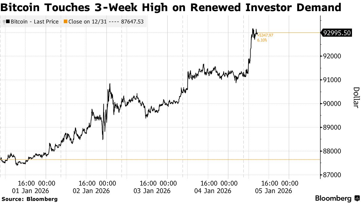 Οπως μεταδίδει το Bloomberg, το μεγαλύτερο κρυπτονόμισμα ενισχύθηκε έως και 2,3% φτάνοντας τις $93.323 τη Δευτέρα το πρωί, το υψηλότερο επίπεδο από τις 11 Δεκεμβρίου. Το Ether και άλλα tokens κινήθηκαν επίσης ανοδικά.