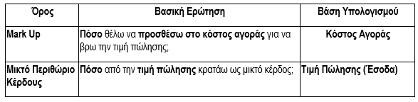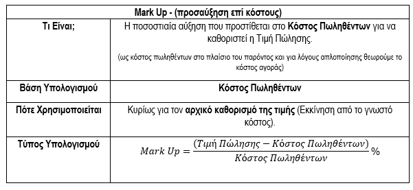- Mark Up: Χρησιμοποιείται για να ορίσουμε την τιμή πώλησης ξεκινώντας από το κόστος (Πόσο θέλω να προσθέσω στο κόστος μου;).