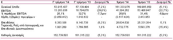 Τα κέρδη προ φόρων (ΕΒΤ) της εταιρείας για το εννεάμηνο του 2014 ανήλθαν στα € (2,5) εκατ. ζημία, έναντι € 2,4 εκατ. κέρδη το εννεάμηνο 2013.