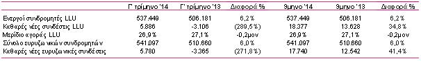 Η συνολική LLU πελατειακή βάση της εταιρείας στο τέλος του εννεαμήνου του 2014 ανήλθε σε 537.449 πελάτες, αύξηση 6,2% σε σχέση με το αντίστοιχο περυσινό εννεάμηνο και το εκτιμώμενο μερίδιο αγοράς στο 26,9%. Παρά το έντονο ανταγωνιστικό περιβάλλον της αγοράς, η hellas online στο γ' τρίμηνο του 2014 απέσπασε το 31,9% των νέων συνδέσεων LLU, ενώ συνολικά για το εννεάμηνο του 2014 το μερίδιο αγοράς σε νέες συνδέσεις LLU ανήλθε σε 22,1%.