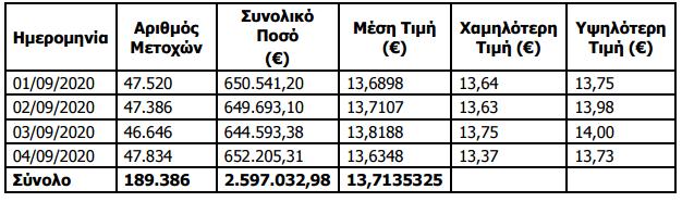 Μετοχών, την περίοδο από 01/09/2020-04/09/2020, αγόρασε συνολικά 189.386 ίδιες
