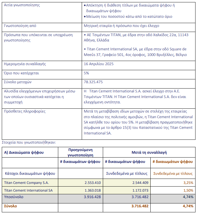 Βρυξέλλες, 23 Απριλίου 2025, 08:30 CEST - Η Titan Cement International SA (εισηγμένη στα χρηματιστήρια Euronext Brussels, Χρηματιστήριο Αθηνών και Euronext Paris, με το σύμβολο «TITC») ανακοινώνει ότι έλαβε την ακόλουθη γνωστοποίηση διαφάνειας με ημερομηνία 16 Απριλίου 2025, στην οποία αναφέρεται ότι στις 16 Απριλίου 2025, το ποσοστό που κατέχει η Titan Cement International SA κατήλθε του ορίου του 5%. Η γνωστοποίηση περιέχει τις ακόλουθες πληροφορίες: