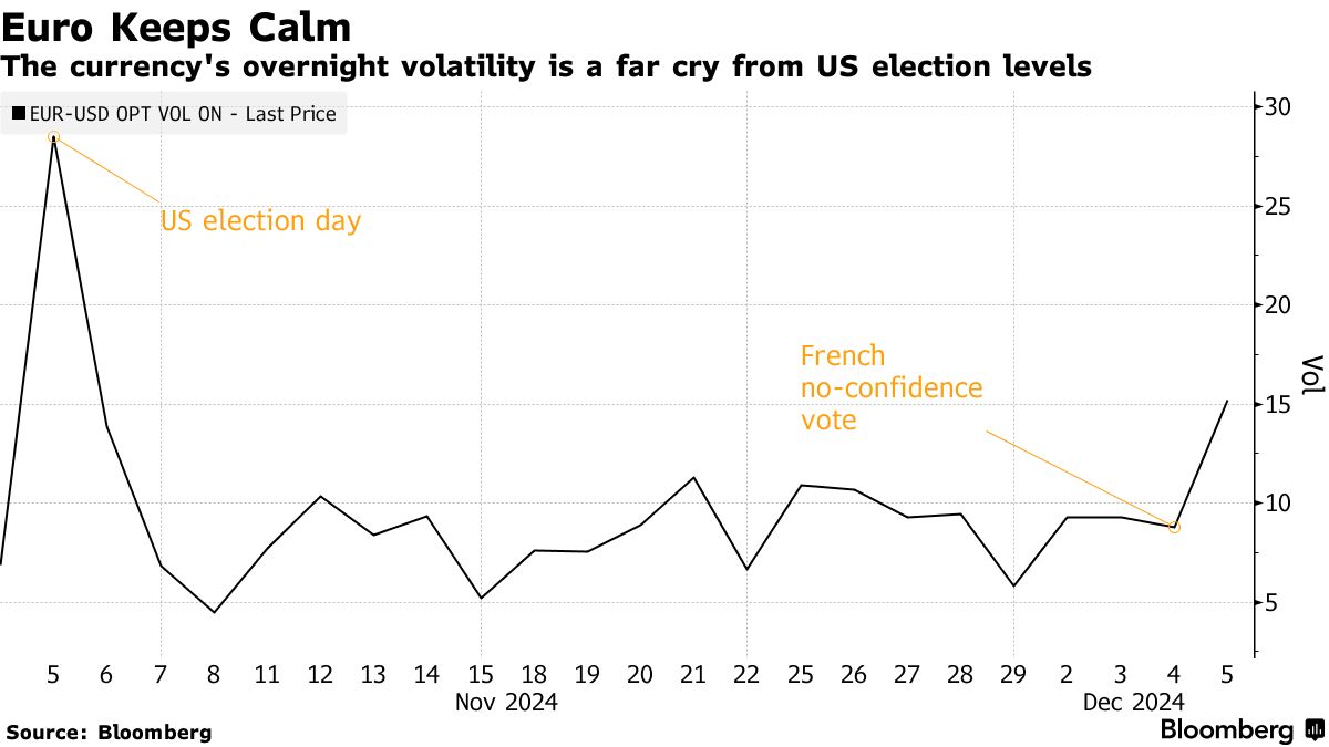Οι traders ζυγίζουν την πορεία του κοινού νομίσματος μετά τη διαμάχη για τον προϋπολογισμό του επόμενου έτους που οδήγησε την ακροδεξιά ηγέτιδα Μαρίν Λεπέν και έναν αριστερό συνασπισμό να προωθήσουν την Τετάρτη μια πρόταση δυσπιστίας κατά της κυβέρνησης του πρωθυπουργού Μισέλ Μπαρνιέ.