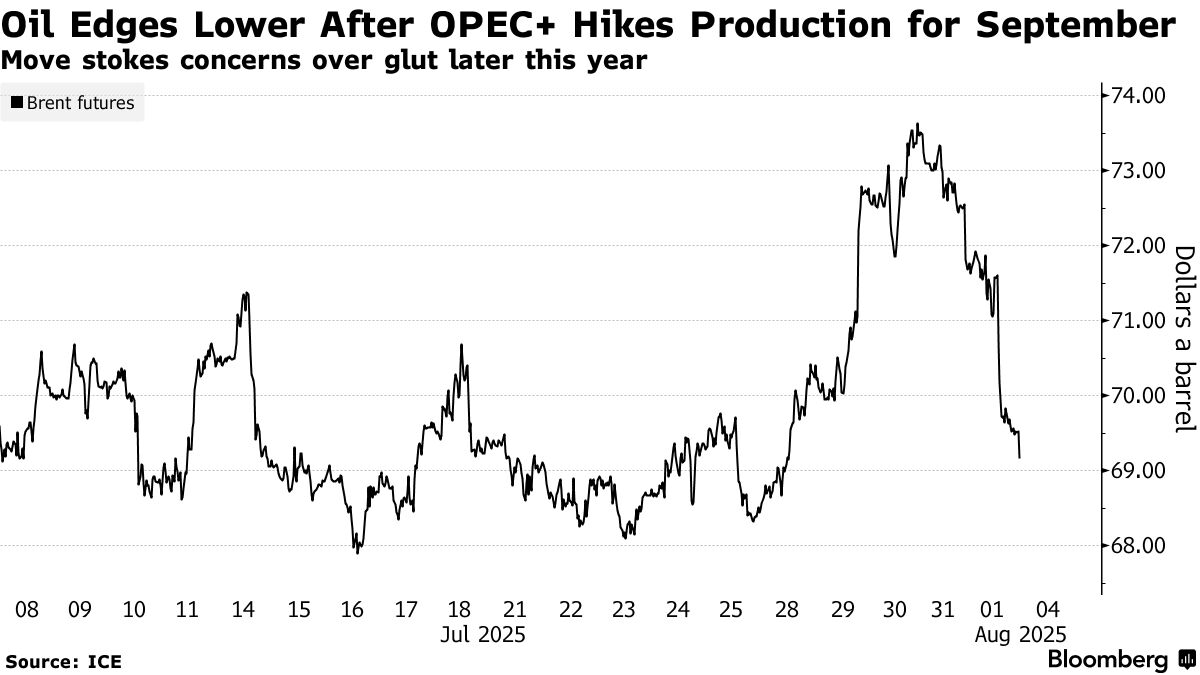 Το Brent υποχώρησε προς τα 69 δολάρια το βαρέλι, ενώ το West Texas Intermediate βρέθηκε κοντά στα 67 δολάρια, αφού ο OPEC+ ενέκρινε πρόσθετη παραγωγή 547.000 βαρελιών ημερησίως από τον Σεπτέμβριο, όπως αναμένονταν. Παραμένει αβέβαιο εάν θα χαλαρώσουν περαιτέρω περιορισμοί στην προσφορά τους επόμενους μήνες.