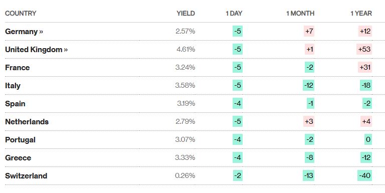 Οι αποδόσεις ευρωπαϊκών 10ετών κρατικών ομολόγων: