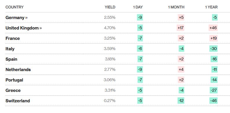 Οι αποδόσεις των ευρωπαϊκών 10ετών κρατικών ομολόγων: