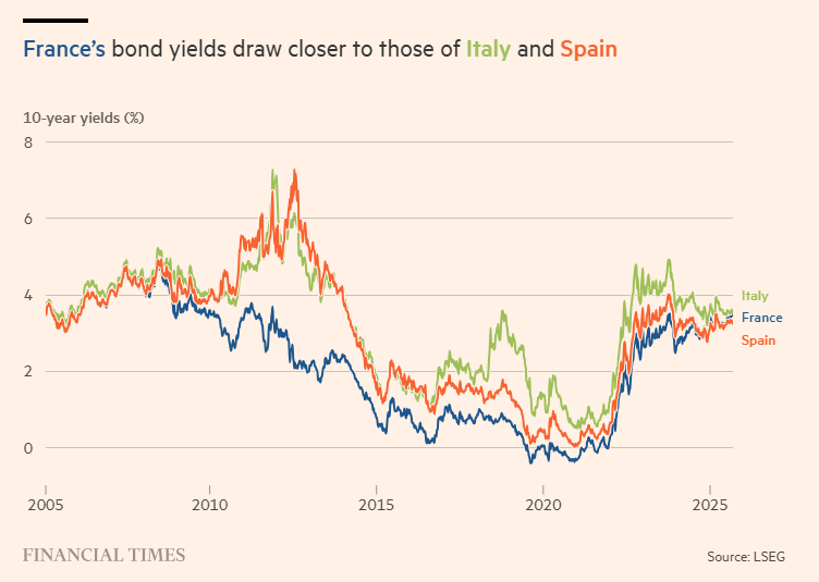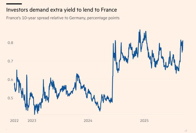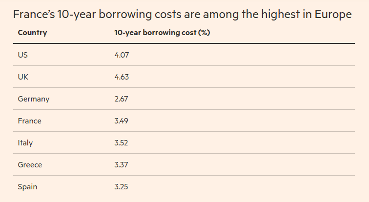 Οπως θυμίζουν οι Financial Times, ο Γάλλος πρωθυπουργός Φρανσουά Μπαϊρού έχασε τη Δευτέρα μια κρίσιμη ψήφο εμπιστοσύνης για τις προσπάθειές του να μειώσει το έλλειμμα μέσω του προϋπολογισμού, γεγονός που έριξε την κυβέρνησή του και επιδείνωσε μια κρίση που έχει ήδη οδηγήσει το κόστος δανεισμού της Γαλλίας κοντά στα υψηλότερα επίπεδα από την εποχή της κρίσης χρέους της Ευρωζώνης.