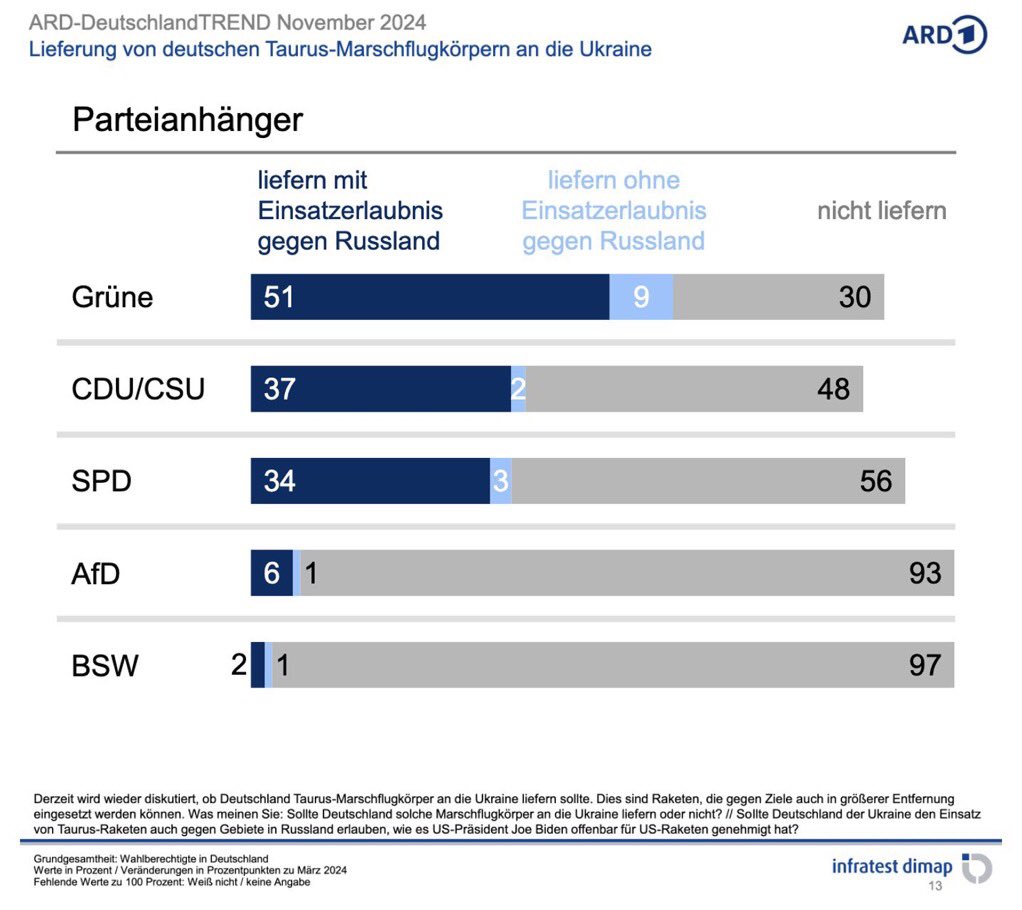 Το συγκεκριμένο κόμμα, κάποτε έντονα φιλειρηνικό, μεταλλάχθηκε σταδιακά, έχοντας καταστεί πλέον ο πιο ένθερμος υποστηρικτής του πολέμου στην Ουκρανία και ειδικότερα υπέρ της παροχής γερμανικών πυραύλων Taurus, για πλήγματα στο βάθος της Ρωσίας. Άποψη που εμφανίζεται πλειοψηφική μόνο στους ψηφοφόρους του, αντίθετα με όλα τα υπόλοιπα κόμματα, κεντρώα, αριστερά και δεξιά!