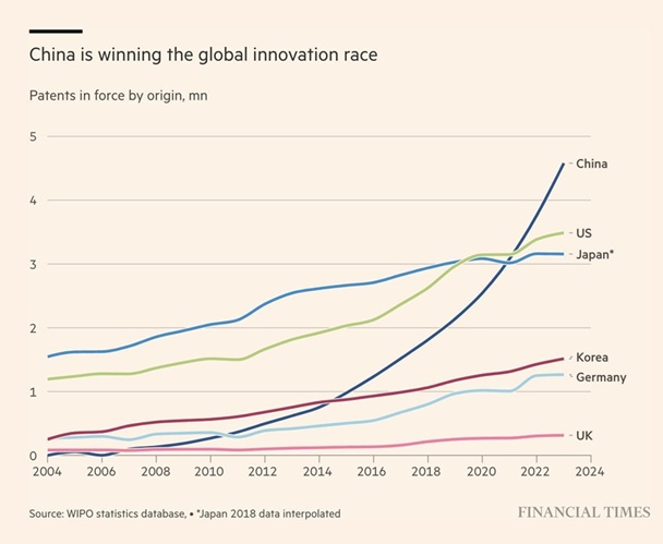 Δεν είναι όμως μόνον οι πράσινοι τομείς. Όπως φαίνεται και στο παρακάτω γράφημα από τους Financial Times, η Κίνα έχει κάνει γιγάντιο άλμα στις πατέντες, κατακτώντας την πρώτη θέση στην καινοτομία γενικώς.