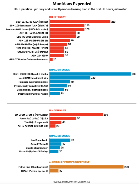 O ρυθμός όμως, με τον οποίο οι Ηνωμένες Πολιτείες και το Ισραήλ αναλώνουν πυρομαχικά εναντίον του Ιράν, μοιάζει πρωτόγνωρος. Σύμφωνα με τις εκτιμήσεις του αμερικανικού Payne Institute for Public Policy, μέσα στις πρώτες 36 ώρες του πολέμου αναλώθηκαν οι ακόλουθες ποσότητες: