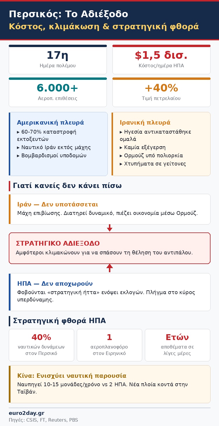 Στην 17η μέρα του πολέμου στον Περσικό, οι ΗΠΑ δαπανούν ποσό που φτάνει περίπου το 1,5 δισ. δολάρια ημερησίως, χωρίς να επιτυγχάνουν ούτε κατάρρευση του ιρανικού καθεστώτος ούτε διάθεση υποταγής, ενώ η τιμή του πετρελαίου έχει αυξηθεί πάνω από 40%. Αμφότερες οι πλευρές βρίσκονται σε στρατηγικό αδιέξοδο που τις ωθεί σε κλιμάκωση πριν από οποιαδήποτε αποκλιμάκωση, με σειρά κρίσιμων «αγνώστων Χ» —από το ιρανικό πυραυλικό οπλοστάσιο ως τον ρόλο-εφεδρείας των Χούθι— να καθορίζουν εάν η σύρραξη θα εξελιχθεί σε «βάλτο» με παγκόσμιες συνέπειες. |