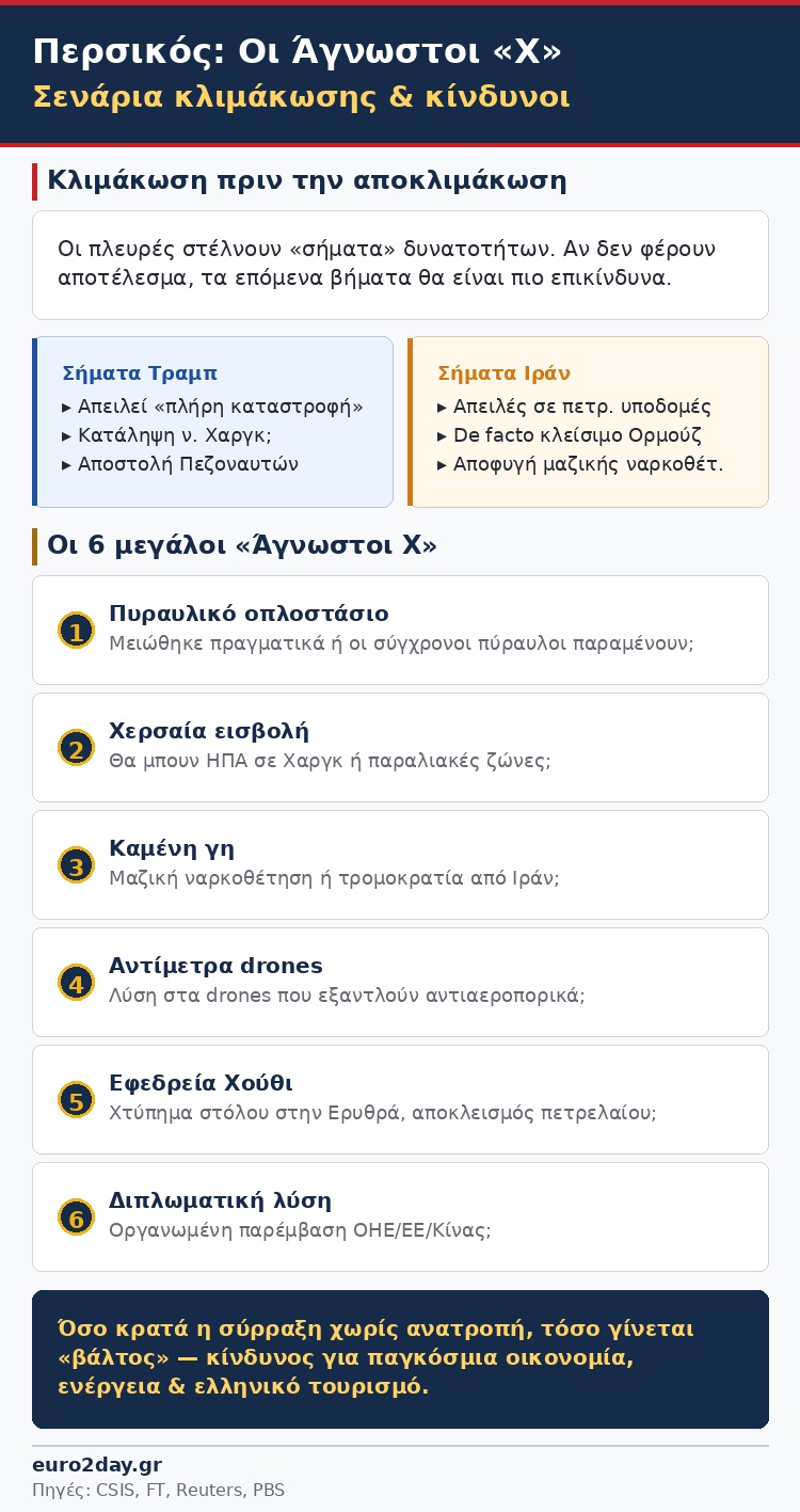 | ► Παρακολουθήστε τυχόν κίνηση αμερικανικών χερσαίων δυνάμεων προς το νησί Χαργκ ή τα στενά του Ορμούζ — θα σηματοδοτούσε κρίσιμη κλιμάκωση με άμεσες επιπτώσεις στις τιμές πετρελαίου και στην παγκόσμια αγορά ενέργειας |