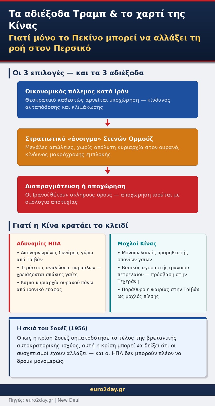 Αυτή ακριβώς η πραγματικότητα οδήγησε χθες τον πρόεδρο Τραμπ να εκπέμψει ένα σχεδόν γκροτέσκο μήνυμα απελπισίας, αποκαλώντας «τρελούς μπάσταρδους» τους ηγέτες του Ιράν και απειλώντας ότι, αν δεν ανοίξουν το «γ@μημένο» Ορμούζ, ολόκληρη η χώρα θα ζήσει μια κόλαση.