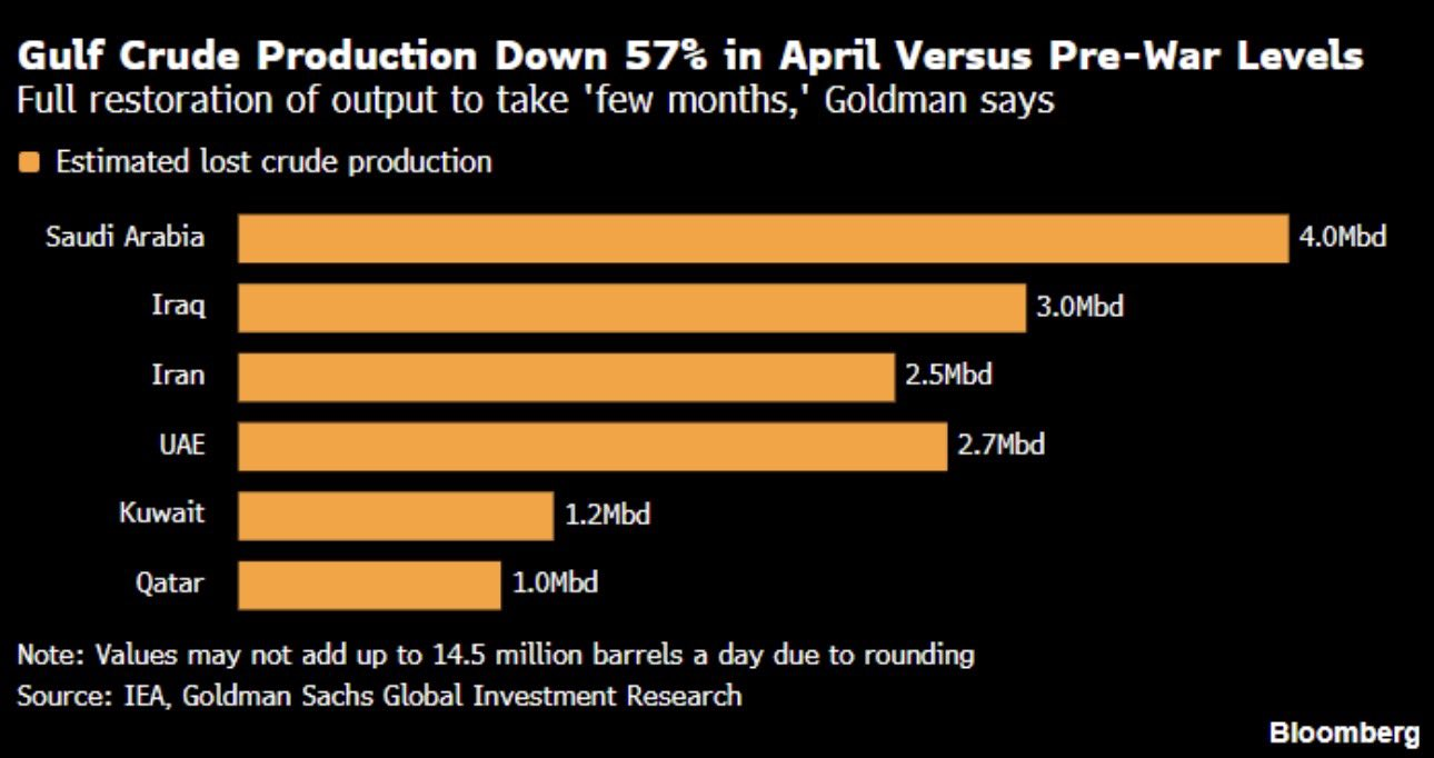 Οι επιπτώσεις ούτως ή άλλως θα μας συνοδεύουν για πολύ καιρό, ενώ κάποιες θα αρχίσουν να φανερώνονται, λένε αρκετοί ειδικοί, μέσα στις επόμενες μία ή δύο εβδομάδες, καθώς τα τάνκερ που ήταν εν πλω έφτασαν και τα αποθέματα παγκοσμίως μειώνονται, ενώ η παραγωγή αργού στον Περσικό Κόλπο έχει υποστεί σοβαρότατο πλήγμα όπως φαίνεται και στον παρακάτω πίνακα.