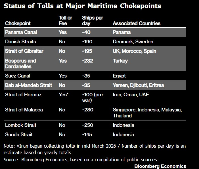 Το Ορμούζ μπορεί να είναι από τα πιο σημαντικά, αλλά ο πλανήτης μας έχει διάφορα θαλάσσια στενά που είναι ιδιαίτερα κρίσιμα για τις οικονομίες πάρα πολλών κρατών, όπως φαίνεται και από τον παρακάτω πίνακα του Bloomberg.