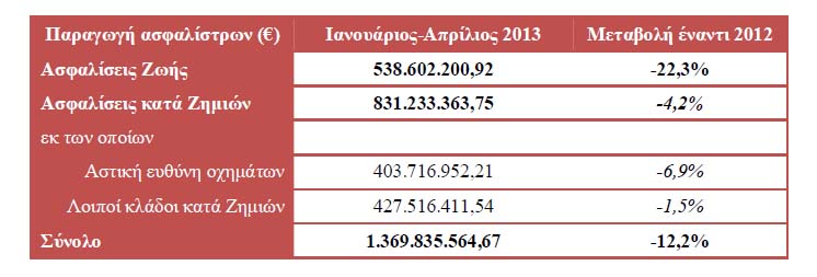 Με βάση λοιπόν τα στοιχεία, η παραγωγή για το σύνολο της ασφαλιστικής αγοράς υποχώρησε κατά 12,2% το πρώτο φετινό τετράμηνο, όταν η αντίστοιχη πτώση ήταν 13,3% στο πρώτο τρίμηνο, 14,1% το πρώτο δίμηνο και 21,5% τον Ιανουάριο.
