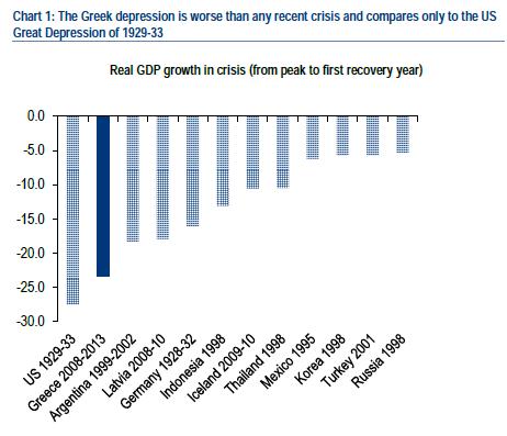 Όπως επισημαίνει η Bank of America Merrill Lynch, η ύφεση στην Ελλάδα είναι η χειρότερη από οποιαδήποτε άλλη πρόσφατη κρίση και μπορεί να συγκριθεί μόνο με την Μεγάλη Ύφεση των ΗΠΑ το 1929-1933. Μια σύγκριση με τις μεγάλες κρίσεις των τελευταίων δεκαετιών δείχνει πως το πραγματικό ΑΕΠ στην Ελλάδα κατέρρευσε από την «κορυφή» του περισσότερο απ' ότι σε οποιαδήποτε άλλη περίπτωση. «Πρέπει να πάμε πίσω στην Μεγάλη Ύφεση των ΗΠΑ για να βρούμε μια πιο σοβαρή συρρίκνωση του ΑΕΠ», σχολιάζει.