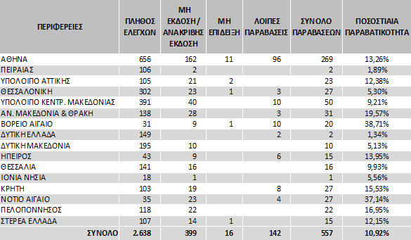 Οι περισσότερες παραβάσεις εντοπίστηκαν στην Αθήνα (269), ενώ η υψηλότερη παραβατικότητα εμφανίζεται στο Βόρειο & Νότιο Αιγαίο με 39% και 37% αντίστοιχα, αναφέρει το Υπουργείο Οικονομικών.