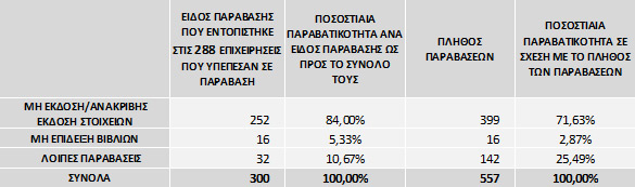 Σε 2.350 από τις ελεγχόμενες επιχειρήσεις δε διαπιστώθηκε καμία παράβαση. Στις υπόλοιπες 288 επιχειρήσεις διαπιστώθηκαν συνολικά 557 παραβάσεις.