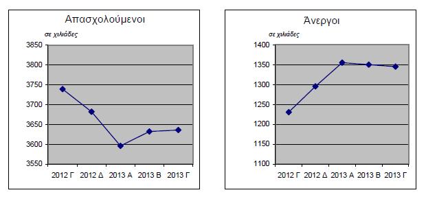 Πιο αναλυτικά, κατά το γ' τρίμηνο του 2013 ο αριθμός των απασχολούμενων ανήλθε σε 3.635.905 άτομα και των ανέργων σε 1.345.387.