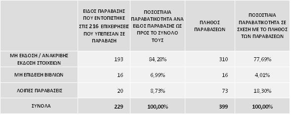 Σε 2.738 από τις ελεγχόμενες επιχειρήσεις δε διαπιστώθηκε καμία παράβαση. Στις υπόλοιπες 216 από τις επιχειρήσεις στις οποίες πραγματοποιήθηκε έλεγχος διαπιστώθηκαν συνολικά 399 παραβάσεις. Η παραβατικότητα και αυτήν την εβδομάδα εντοπίζεται κυρίως στη μη έκδοση στοιχείων.