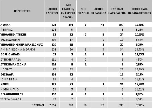 Το σύνολο της αξίας των προστίμων του ελέγχου εκτιμάται ότι θα ανέλθει στο ποσό των 273.650 ευρώ. Οι περισσότερες παραβάσεις εντοπίστηκαν στην Αθήνα (190), ενώ η υψηλότερη παραβατικότητα εμφανίζεται στο Βόρειο Αιγαίο με 18,75%.