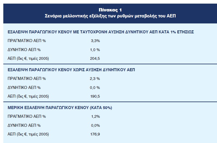 Το πρώτο και πιο αισιόδοξο σενάριο προϋποθέτει την πλήρη εξάλειψη του παραγωγικού κενού έως το τέλος του 2020, με την ταυτόχρονη υπόθεση ότι ο ρυθμός μεταβολής του δυνητικού ΑΕΠ θα σημειώνει θετική μεταβολή την περίοδο 2014-2020, κατά 1% ετησίως5. Σύμφωνα με αυτό το σενάριο, η ελληνική οικονομία θα έχει μέσο ρυθμό μεταβολής του ΑΕΠ 3,3% για την περίοδο 2014-2020 και το πραγματικό ΑΕΠ θα διαμορφωθεί σε 204,5 δισ. €, όσο περίπου ήταν δηλαδή το 2009, όταν ξεκίνησε η κρίση.