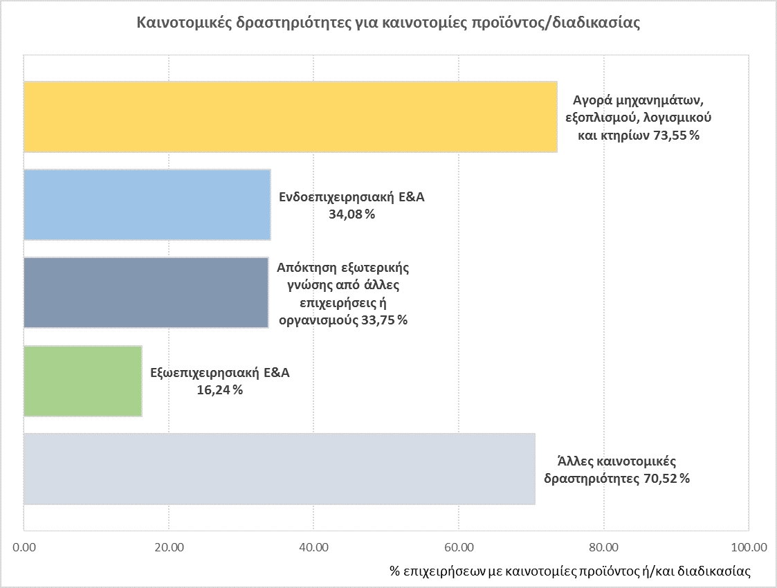 Οι ελληνικές επιχειρήσεις που καινοτομούν σε προϊόντα ή/και διαδικασίες προχωρούν στην αγορά μηχανημάτων, εξοπλισμού, λογισμικού και εγκαταστάσεων (73,55% των επιχειρήσεων με καινοτομίες προϊόντος ή/και διαδικασίας), επενδύουν σε δραστηριότητες όπως ο σχεδιασμός των προϊόντων, οι ενέργειες προώθησης/εισαγωγής καινοτομιών στην αγορά και η κατάρτιση του προσωπικού (70,52%), υλοποιούν δραστηριότητες Έρευνας και Ανάπτυξης (34,08%) επιλέγουν την απόκτηση εξωτερικής γνώσης από άλλες επιχειρήσεις/οργανισμούς (33,75%), ενώ σε μικρότερο ποσοστό οι επιχειρήσεις αναθέτουν δράσεις Έρευνας & Ανάπτυξης σε τρίτους φορείς (16,24%).