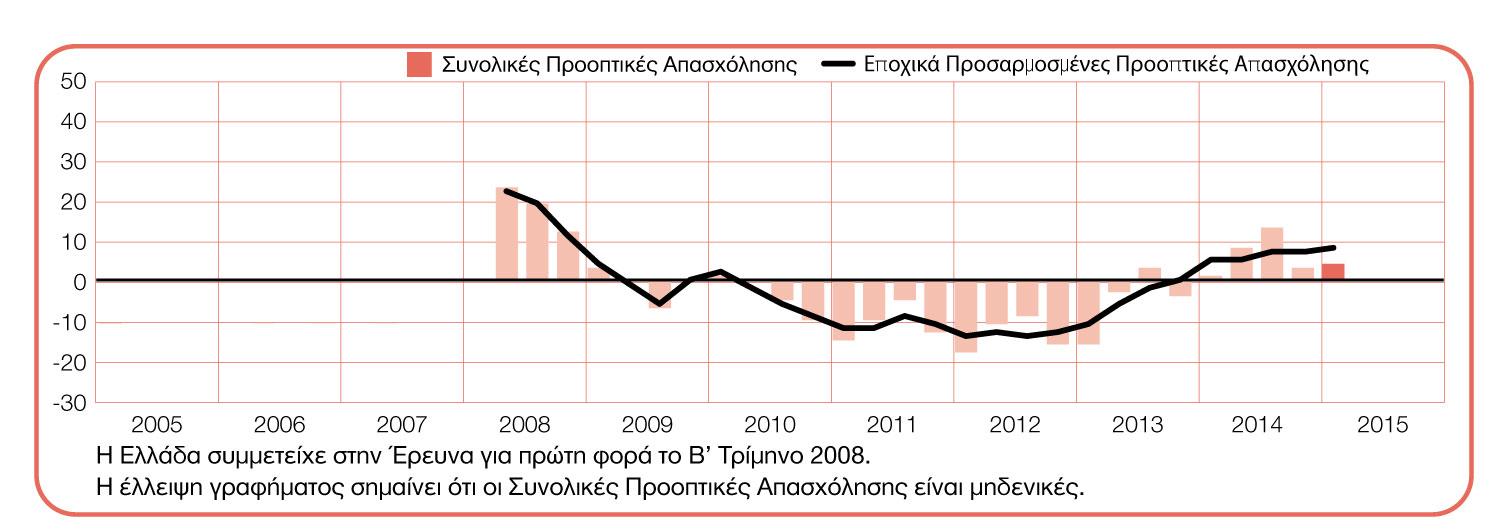 Με το Δείκτη των Προοπτικών Απασχόλησης -προσαρμοσμένο σύμφωνα με την εποχικότητα- να διαμορφώνεται στο +8%, οι εκτιμήσεις των Ελλήνων εργοδοτών είναι οι πιο αισιόδοξες που έχουν καταγραφεί από το δ΄ τρίμηνο του 2008.