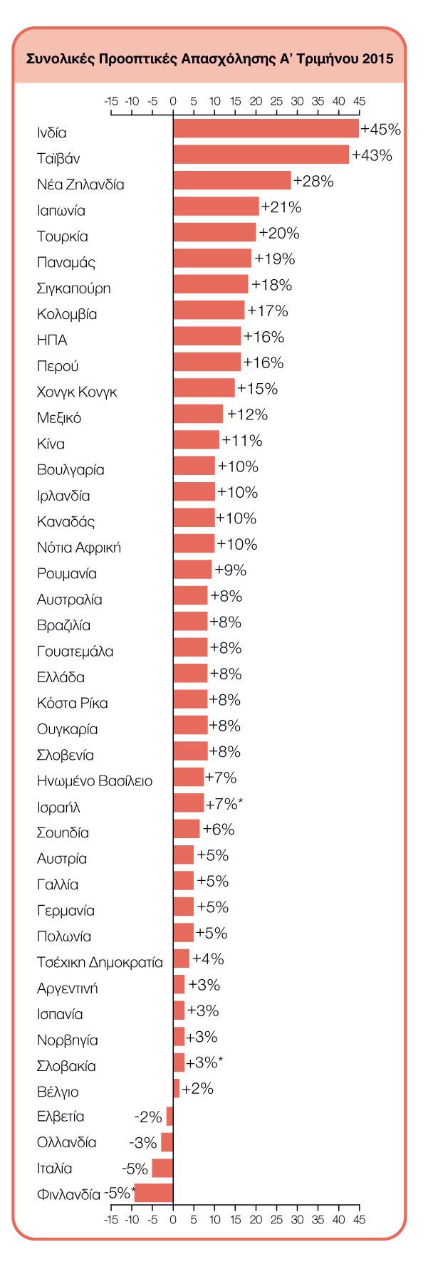 Περισσότεροι από 65.000 εργοδότες σε 42 χώρες συμμετείχαν στην έρευνα της ManpowerGroup για τη σφυγμομέτρηση της αναμενόμενης δραστηριότητας στην αγορά εργασίας κατά την περίοδο Ιανουαρίου-Μαρτίου 2015. Όλοι οι συμμετέχοντες απάντησαν στην εξής ερώτηση: «Ποια πιστεύετε ότι θα είναι η μεταβολή στο συνολικό αριθμό των ατόμων που απασχολούνται στον οργανισμό σας, στην περιοχή ευθύνης σας, κατά τους τρεις επόμενους μήνες, μέχρι και το τέλος Μαρτίου 2015, σε σχέση με το τρέχον τρίμηνο;»