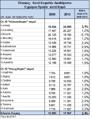 Χαρακτηριστικό της ανισομερούς ανάπτυξης της χώρας είναι το γεγονός πως το 2012 το κατά κεφαλήν ΑΕΠ της Αττικής υπερείχε κατά 33,4% της επόμενης πλουσιότερης περιοχής του Νοτίου Αιγαίου. Το 2000 η διαφορά ήταν μόλις 3,9%. Επιπλέον, μεταξύ των πλουσιότερων περιοχών της χώρας υπήρξε και μία (η Βοιωτία) η οποία είδε το Ακαθάριστο Εγχώριο
