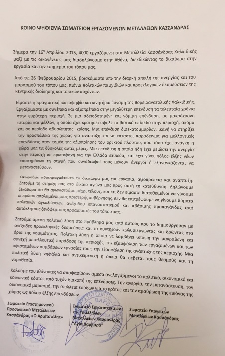 Καλούμε τους εργαζόμενους να κινητοποιηθούν για αυτά τα αιτήματα και να απορρίψουν τις μεθοδεύσεις της Eldorado Gold που επιδιώκει να τους χρησιμοποιήσει για τις δικές της σκοπιμότητες".