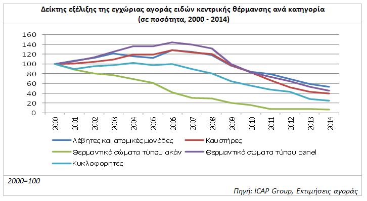 Η κ. Ελένη Βλάχου, Consultant στη Διεύθυνση Οικονομικών Μελετών της ICAP Group, η οποία επιμελήθηκε τη συγκεκριμένη κλαδική μελέτη, σημειώνει σχετικά με τις εξελίξεις της συγκεκριμένης αγοράς: «Μείωση παρουσιάζει και η συνολική εγχώρια αγορά των καυστήρων τα τελευταία χρόνια. Ειδικότερα, τα έτη 2014, 2013 και 2012 η αγορά μειώθηκε κατά 9,4%, 17,9% και 22% αντίστοιχα. Η ζήτηση θερμαντικών σωμάτων τύπου Ακάν η οποία καλύπτεται από την εγχώρια παραγωγή κυμαίνεται σε πολύ χαμηλά επίπεδα, παρουσιάζοντας διαχρονική μείωση. Οι πωλήσεις σωμάτων τύπου panel μειώθηκαν κατά 13,3% το 2014, κατά 17,8% το 2013 και κατά 13,1% το 2012. Η ζήτηση κυκλοφορητών, η οποία καλύπτεται αποκλειστικά από εισαγωγές, εμφάνισε σημαντική μείωση κατά 10,5%, 35,3% και 9,1% τα έτη 2012, 2013 και 2014 αντίστοιχα. Οι αντλίες θερμότητας έχουν αναπτυχθεί στην ελληνική αγορά τα τελευταία χρόνια. Το 2012 η ζήτηση για αντλίες θερμότητας εμφάνισε σημαντική αύξηση σε σύγκριση με το 2011, ενώ το 2013 δεν παρουσίασε αξιόλογη μεταβολή. Η αγορά των ενεργειακών τζακιών μετά την ανοδική πορεία που παρουσίασε την περίοδο 2010-2012, εμφάνισε σημαντική πτώση (περίπου 40%) το 2013. Η πτωτική πορεία συνεχίστηκε και το 2014, αλλά με χαμηλότερο ρυθμό (-20%)».