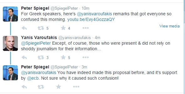 Ο Peter Spiegel παρέθεσε video με την ομιλία του Γ. Βαρουφάκη, καθώς ορισμένοι μετέφεραν λανθασμένα τη δήλωση για τη αγορά των ομολόγων της ΕΚΤ από τον ESM ως σκέψη να αθετηθούν οι πληρωμές που πρέπει να γίνει Ιούλιο και Αύγουστο.