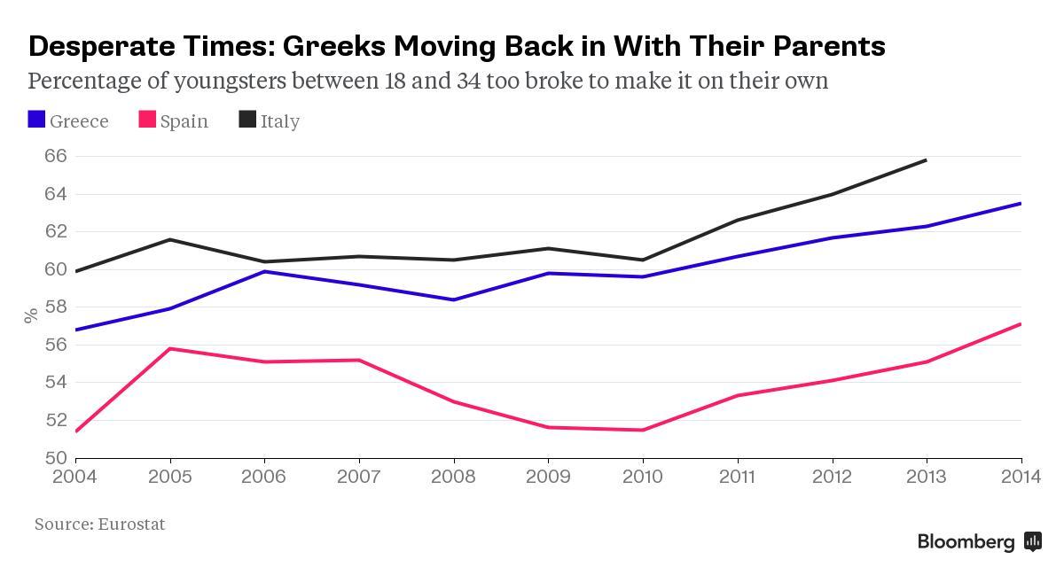 Κοιτάζοντας τα στοιχεία για την ανεργία των νέων στην Ελλάδα –όπου πάνω από το 50% των νέων ηλικίας έως 24 ετών δεν εργάζονται- δεν αποτελεί έκπληξη που πολλοί από αυτούς μένουν με τους γονείς τους.