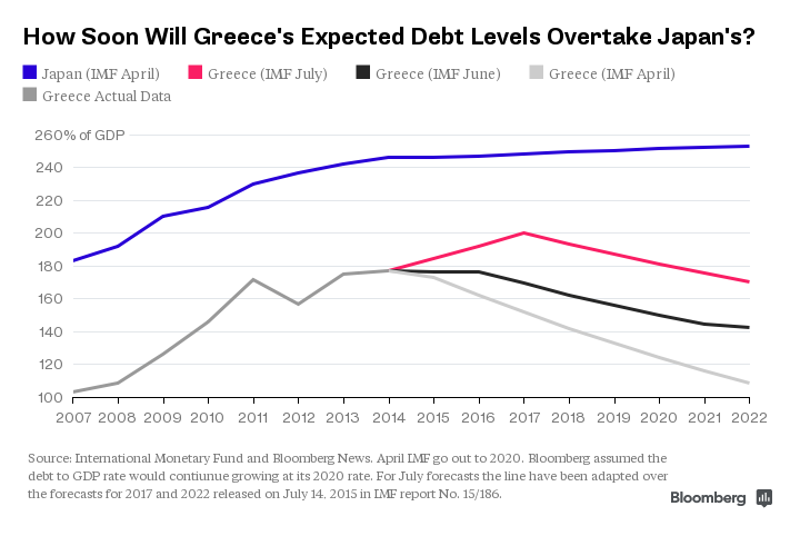 Δεν έχει περάσει πολύς καιρός από τότε που ο οικονομολόγος του Σικάγο Luigi Zingales έγραψε σχετικά με ένα «τρομακτικό αστείο» που άκουσε από τους συναδέλφους του και πήγαινε κάπως έτσι: «Ποια είναι η διαφορά μεταξύ Ιαπωνίας και Ελλάδας;» Απάντηση: «Τρία χρόνια». Τώρα ακόμα κι αυτή η χρονική απόσταση φαίνεται πολύ μεγάλη.Η μελέτη της 14ης Ιουλίου από το ΔΝΤ για το χρέος της Ελλάδας ως ποσοστό του ΑΕΠ προέβλεψε για το 2017 περίπου 200% χρέος, κάτι που το φέρνει σημαντικά ψηλότερα από την εκτίμηση του Απριλίου, που ανερχόταν στο 151,8%.