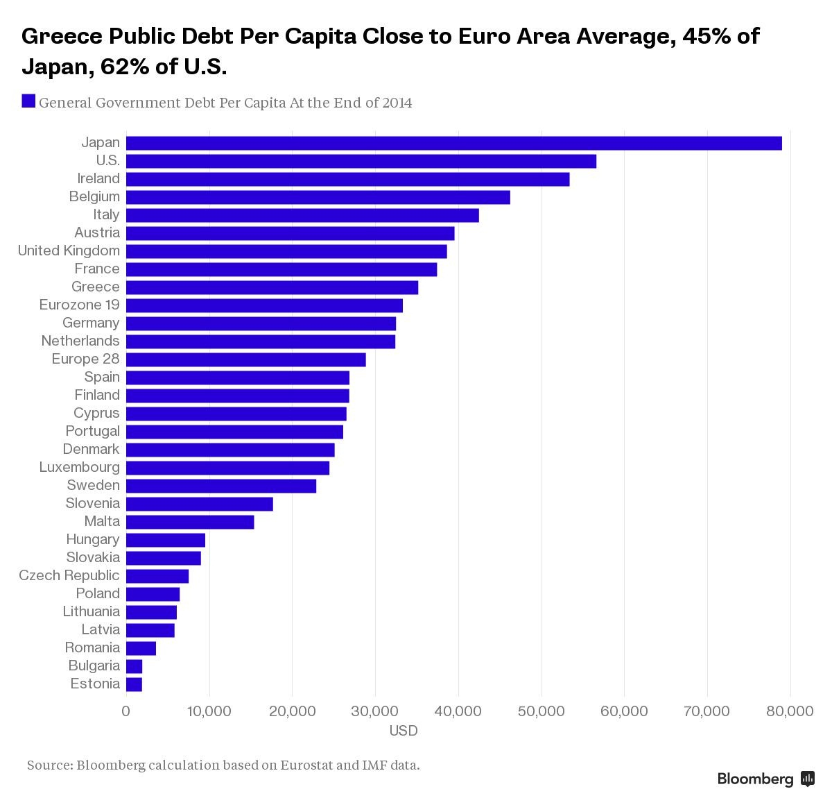 Αν όμως δει κανείς το κατά κεφαλήν χρέος της Ελλάδας, η εικόνα είναι κάπως λιγότερο αποκαρδιωτική. Στο τέλος του 2014 το χρέος της Ελλάδας ήταν κάτι παραπάνω από $35.000 ανά κάτοικο, σύμφωνα με τη Eurostat, τη στιγμή που το ίδιο ποσό για την Ιαπωνία είναι $79000, όπως δείχνουν οι υπολογισμοί του Bloomberg. Το κατά κεφαλήν χρέος των ΗΠΑ έφτασε τα $56600, σύμφωνα με δεδομένα του αμερικανικού υπουργείου Οικονομικών. Σε σχέση με άλλες ευρωπαϊκές χώρες, οι Έλληνες πολίτες βρίσκονται σε χαμηλότερο σημείο από αυτό τους Ιρλανδούς, τους Βέλγους, τους Ιταλούς , τους Βρετανούς και τους Γάλλους.