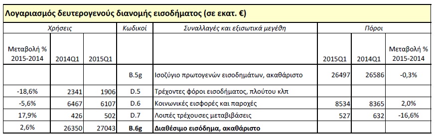 Ακρως εντυπωσιακά είναι τα στοιχεία της ΕΛΣΤΑΤ για το εισόδημα και την αποταμίευση των νοικοκυριών το πρώτο τρίμηνο της χρονιάς. Σύμφωνα με τους «τριμηνιαίους μη χρηματοοικονομικούς λογαριασμούς θεσμικών τομέων» το διαθέσιμο εισόδημα του τομέα των νοικοκυριών (περιλαμβάνονται και μη κερδοσκοπικά ιδρύματα που εξυπηρετούν νοικοκυριά - ΜΚΙΕΝ) αυξήθηκε κατά 2,6% σε σύγκριση με το αντίστοιχο τρίμηνο του προηγούμενου έτους, από 26,3 δισ. ευρώ σε 27 δισ. ευρώ.